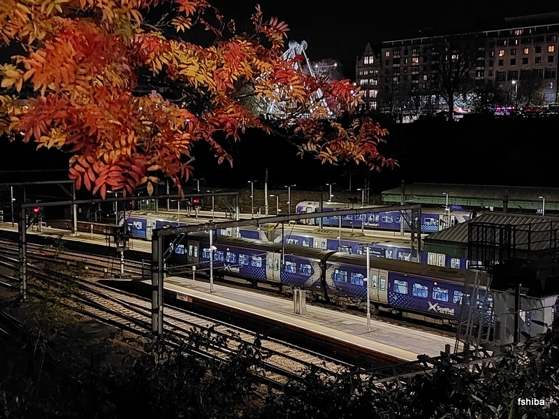 Tramやバスが通る大通りの南側には、通りに沿った掘割の中にNational RailのEdinbrugh Waverley駅があります。いわゆるエディンバラ駅に相当する大きなターミナル駅で、駅を跨ぐ橋から様子をのぞいてみました。紅葉した葉っぱが和風の趣です。
