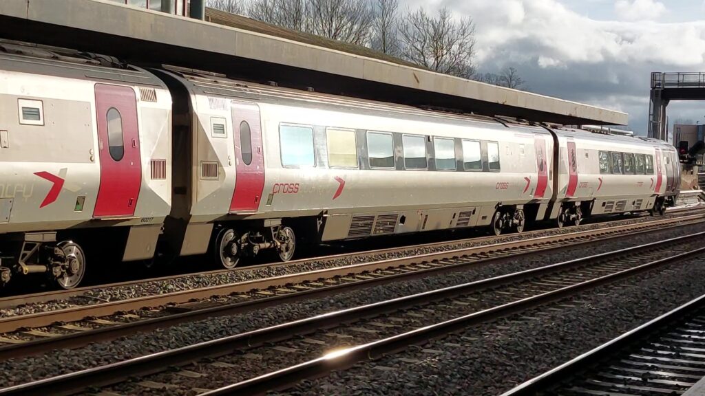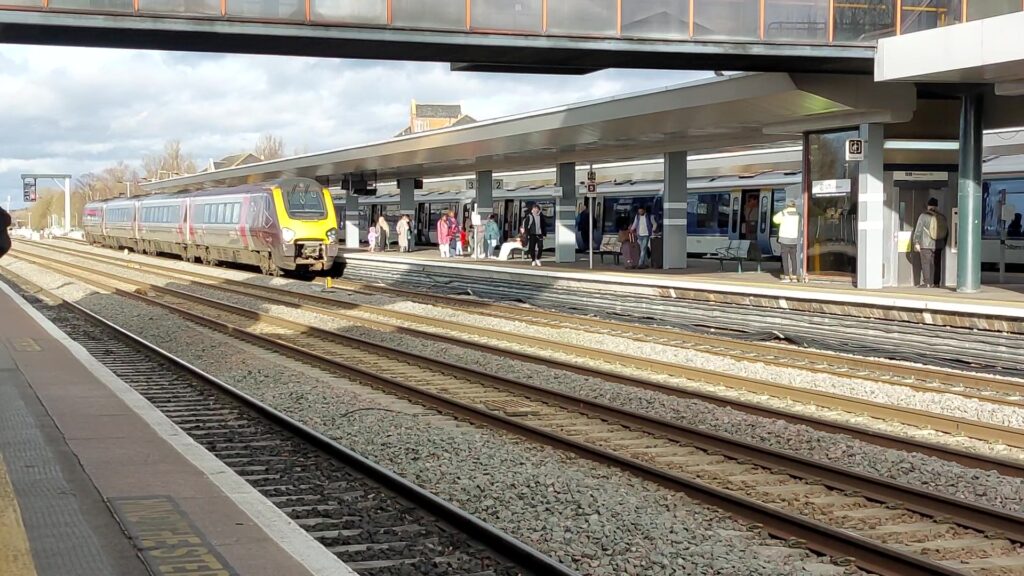 上りローカル列車のDidcot Parkway行きは通常Oxford駅上りホームの3番線から発車するのですが、この日は遅延しているCross Countryの上り列車を3番線に入れるためか、ローカル列車は下りホームの4番線から発車となりました(もしかしたら所定かも知れません)。ローカルを待っていると向かいの3番線にCross Countryが入線してくるのが見えました。